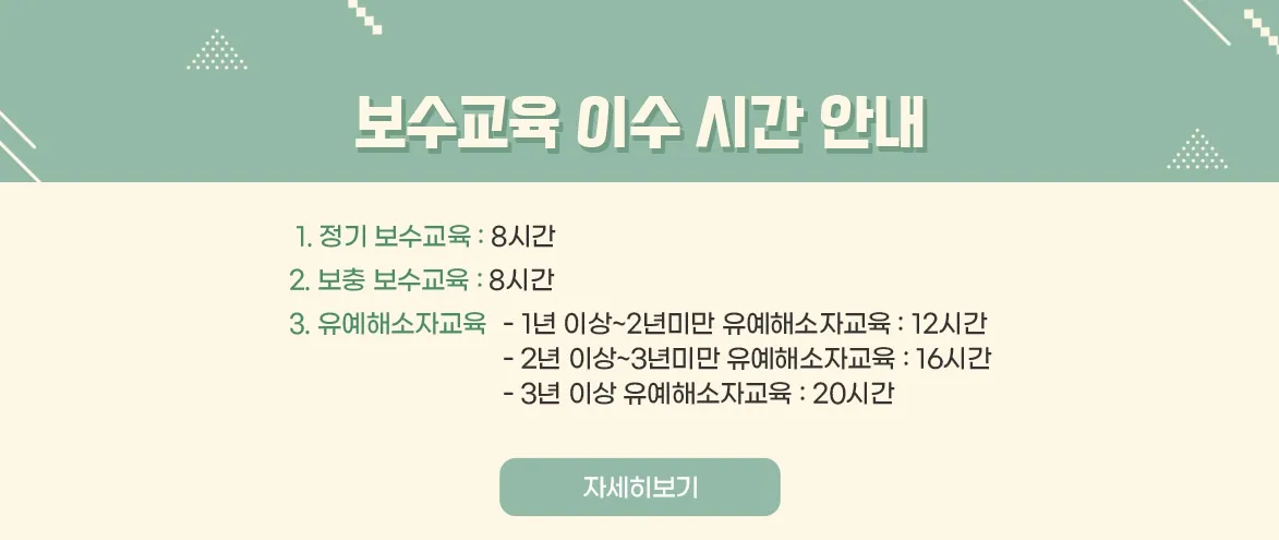 보수교육은 정기보수교육, 보충교육, 유예해소자 교육인지에 따라 교육시간이 달라집니다.