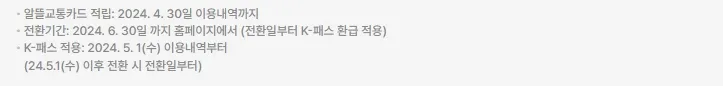 기존에 알뜰교통카드를 사용하고 있는 분들은 별도의 카드 재발급 없이 K패스 카드로 전환할 수 있습니다. 알뜰교통카드 계정 그대로 이용가능하시면 4월 30일까지 회원전환을 하지 않는 경우 회원전환일 또는 K패스 신규가입일부터 혜택이 적용됩니다.